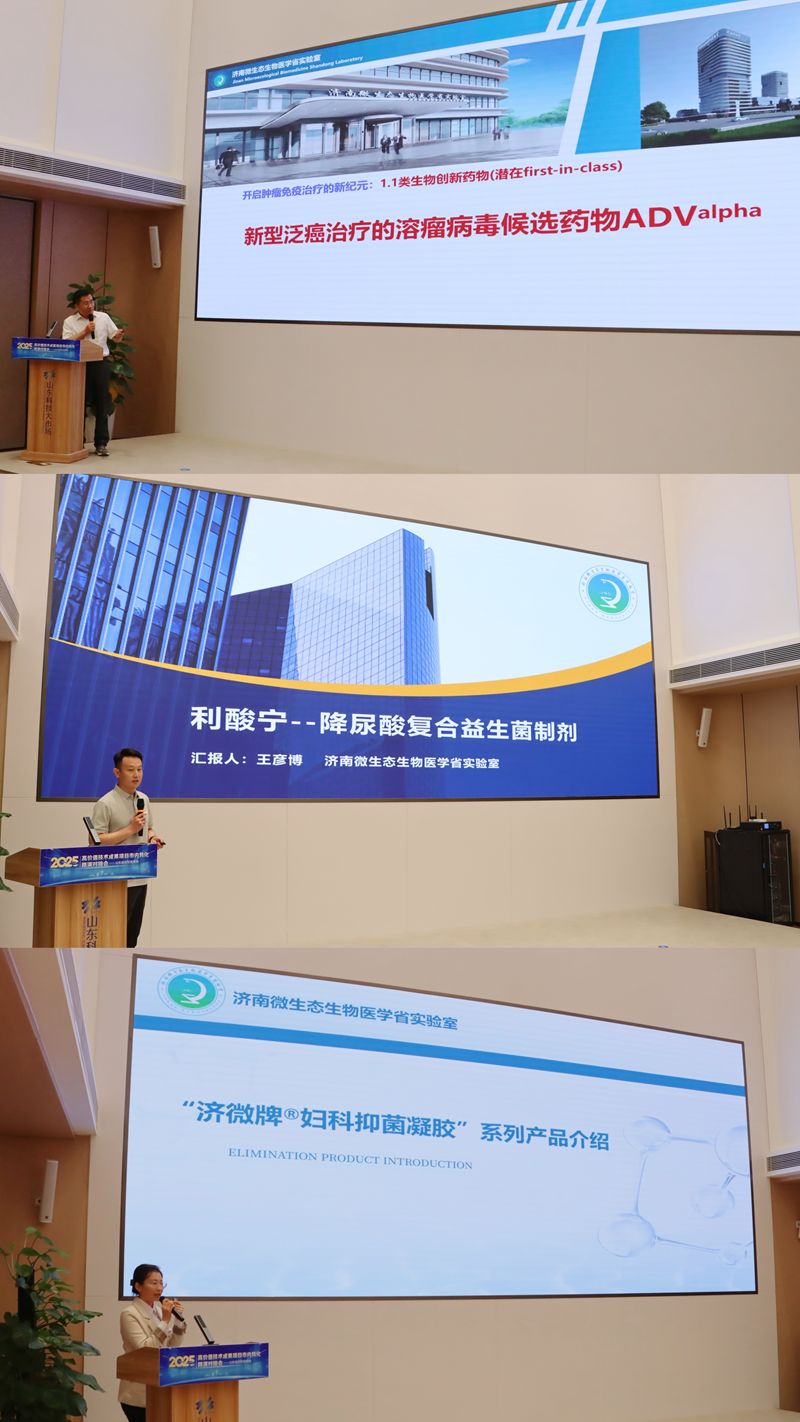 在路演环节中,实验室重点展示了以下三个创新项目:一是新型泛癌治疗的溶瘤病毒候选药物ADV alpha,该项目基于前沿溶瘤病毒技术,针对多种实体瘤开发了具有广谱抗肿瘤潜力的候选药物,为癌症治疗提供了新策略;二是通过微生态调控技术研发的降尿酸复合益生菌固体制剂“利酸宁”,可有效降低血尿酸水平,为高尿酸血症及痛风患者提供安全、长效的干预方案;三是依托微生态平衡理论开发的妇科外用制剂,“济微牌®妇科抑菌凝胶”系列产品,具有调节菌群、抑制病原微生物的作用,致力于女性健康领域的技术转化。